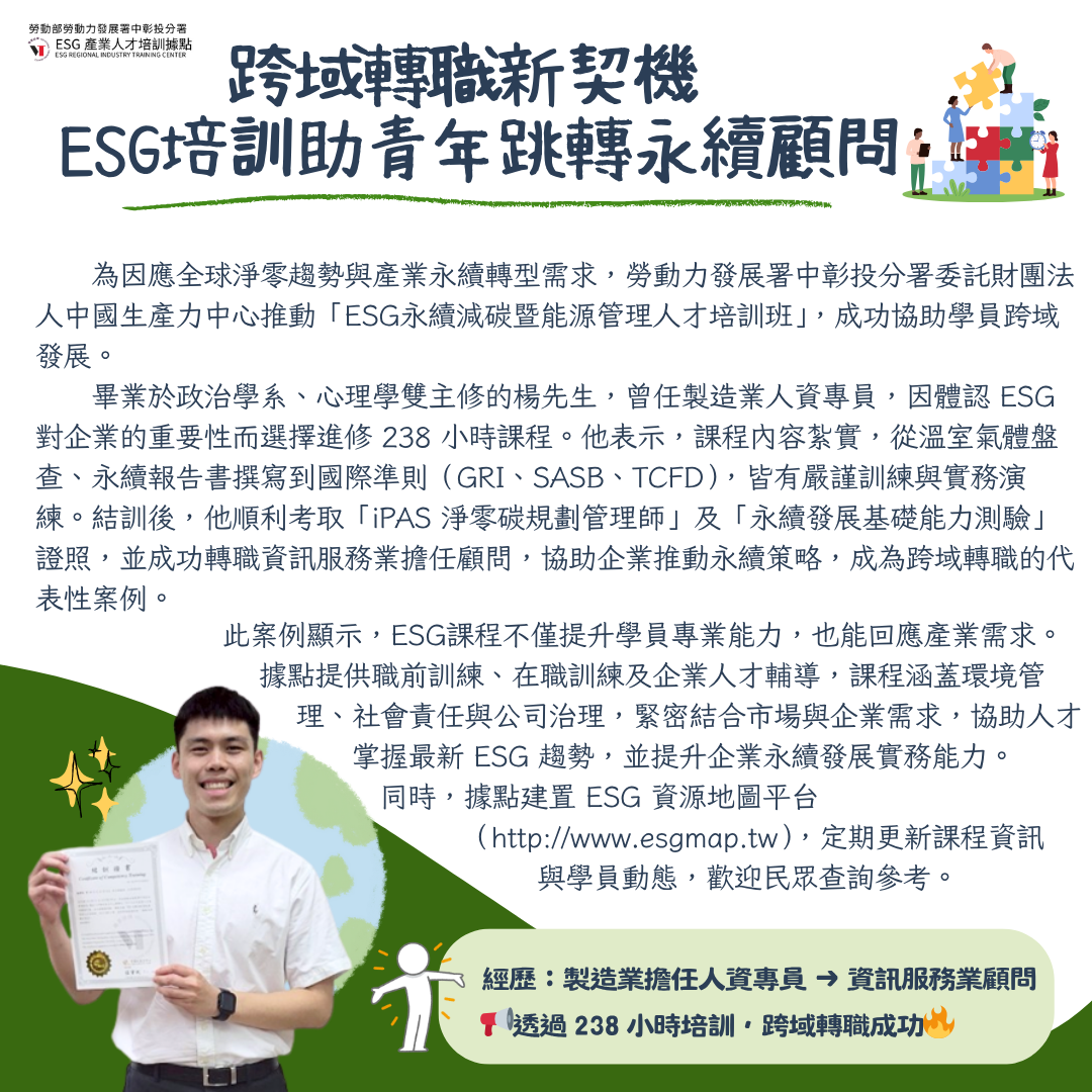 為因應全球淨零趨勢與產業永續轉型需求,勞動力發展署中彰投分署委託財團法人中國生產力中心推動「ESG永續減碳暨能源管理人才培訓」,成功培育跨領域專業人才。其中,畢業於國立中正大學政治學系並雙主修心理學的楊先生,即是透過課程完成跨域轉職、投身永續領域的代表性案例。