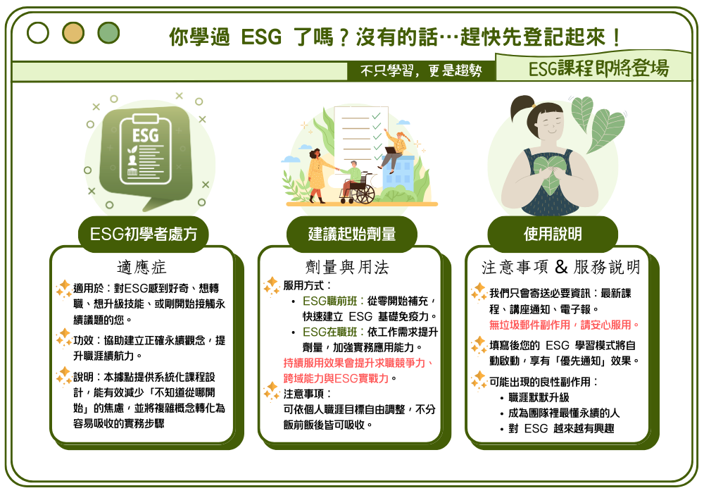 我們 2026 的課程從入門到實戰通通都有,無論你是想轉職、提升專業, 或只是想弄懂 ESG 到底在紅什麼,都能找到最適合自己的起點。