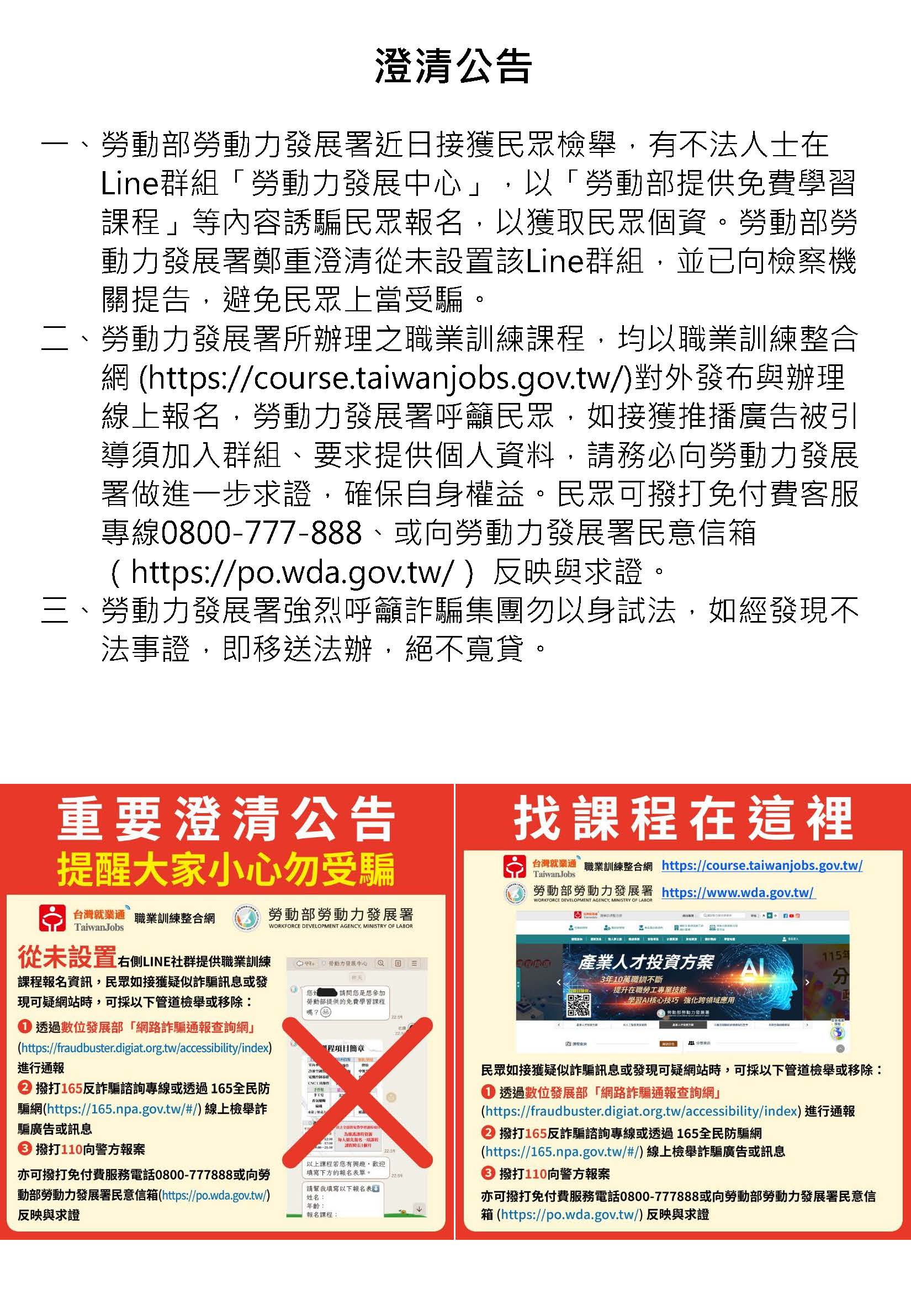勞發署LOGO遭冒用設置為職業訓練LINE群組以誘騙民眾報名。為免民眾受騙,檢附發布之澄清公告。